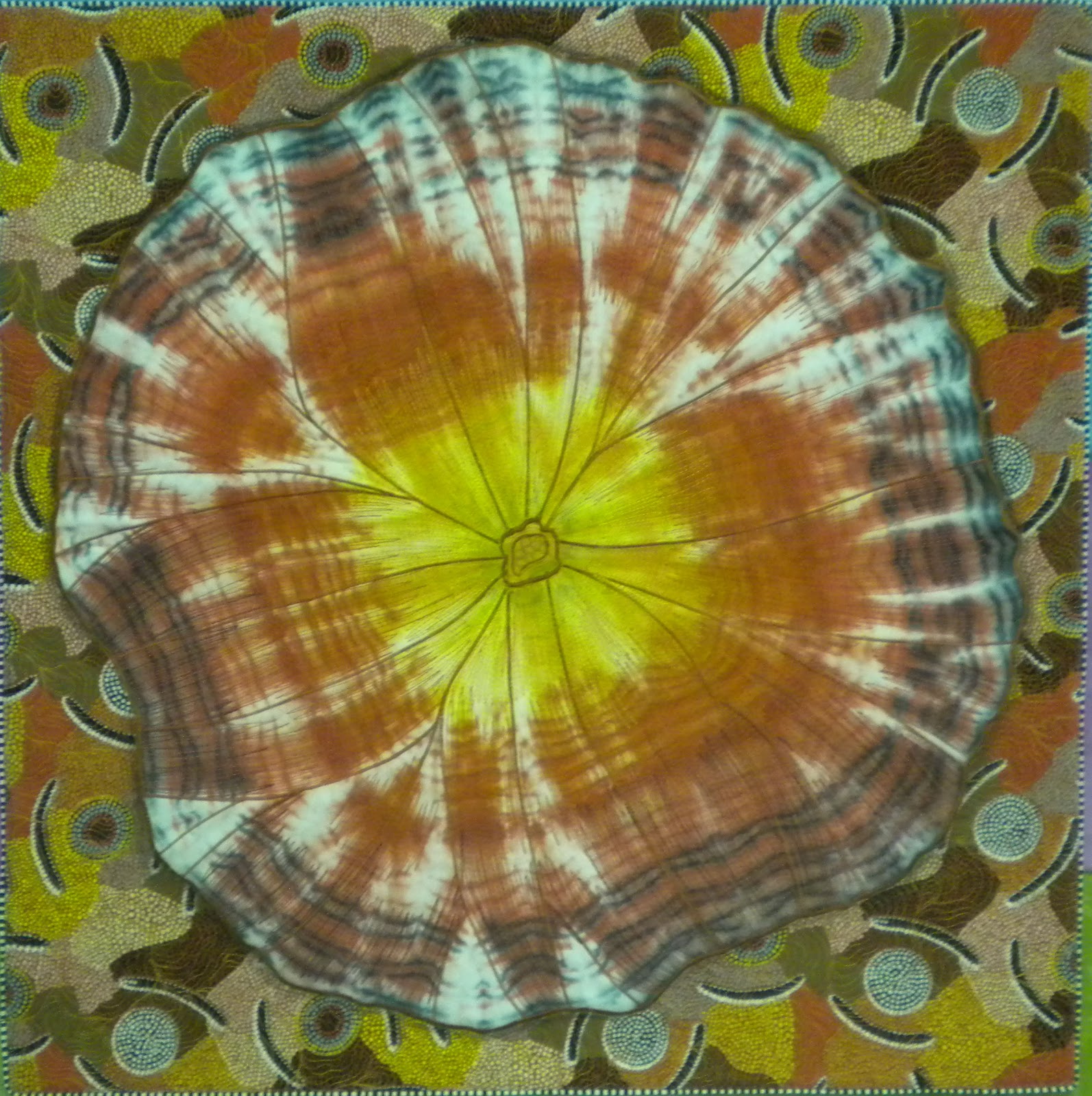 Jamie's center fabric was dyed by pulling up the center of a square of white fabric and wrapping it from that center point to the edge with four cords. Starting in the center, a yellow cord was wrapped around the outside of the fabric. An orange cord overlapped the yellow, red overlapped the orange, and finally black overlapped the red. The cords were held in place with thread. When the fabric was dried and pressed, she cut out the irregular circle after applying a fusible web. The "flower" was adhered to the background and she satin stitched the veins and the outside edge. Once layered over batting and backing, the piece was thread painted and the background was tightly quilted.